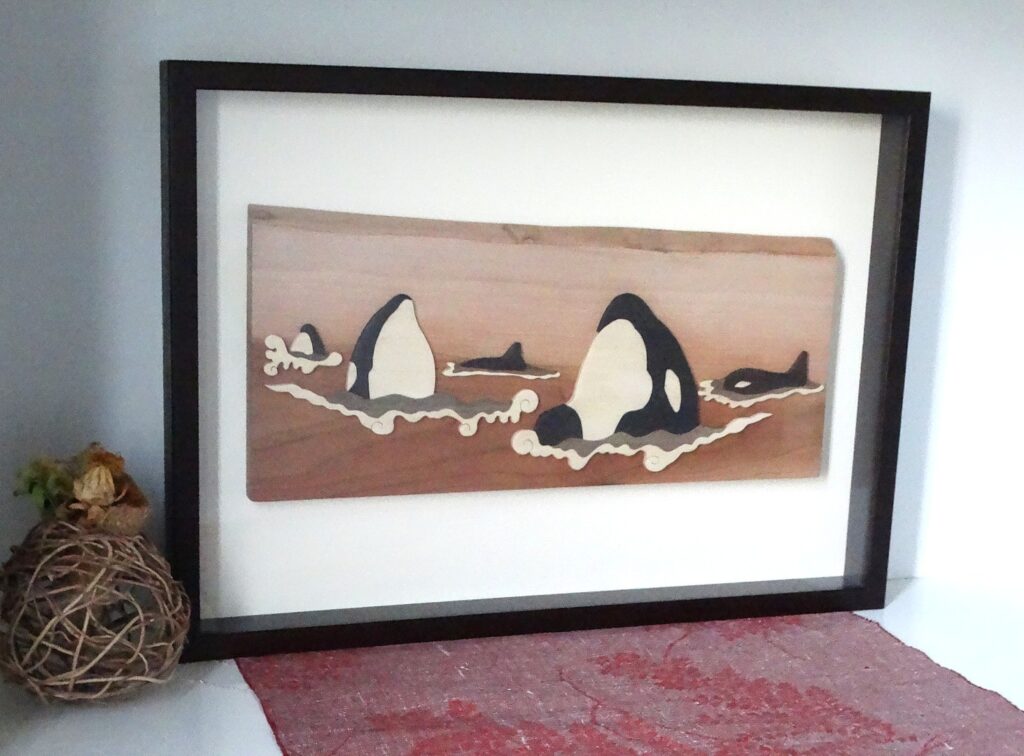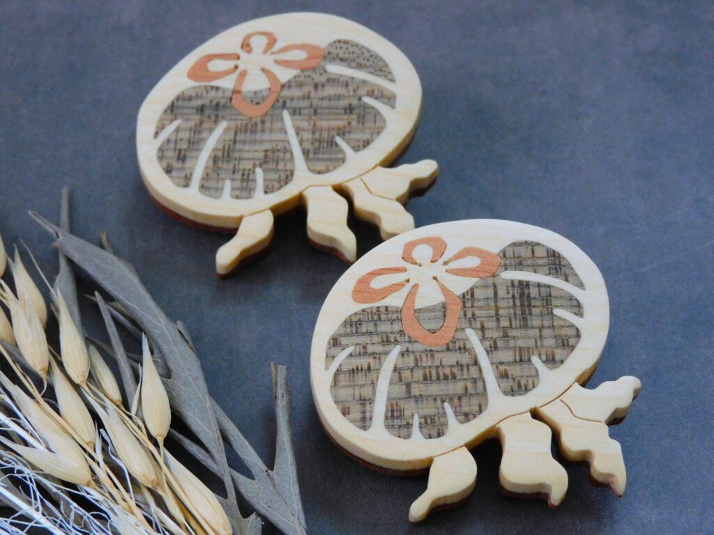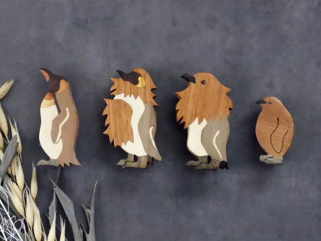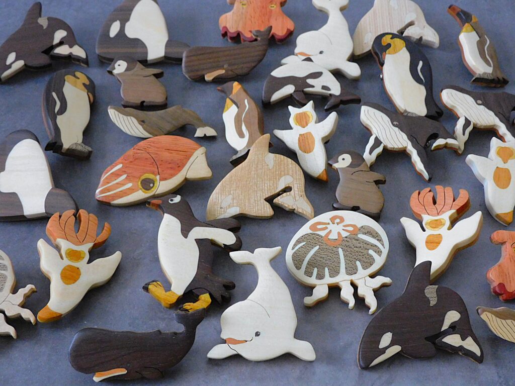天然木の色味を活かし、パズルのように嵌め込んで模様をつくる『木象嵌(もくぞうがん)』という伝統技法を用いてメンダコ・シャチ・ペンギンなどの「いきものブローチ」をつくっています。